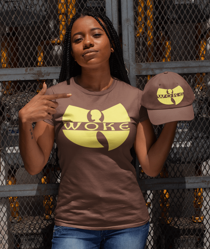 New color way for our popular WOKE tee. Gold design on Soft Feel Heather Brown Bella-Canvas t-shirt. Unisex fit.